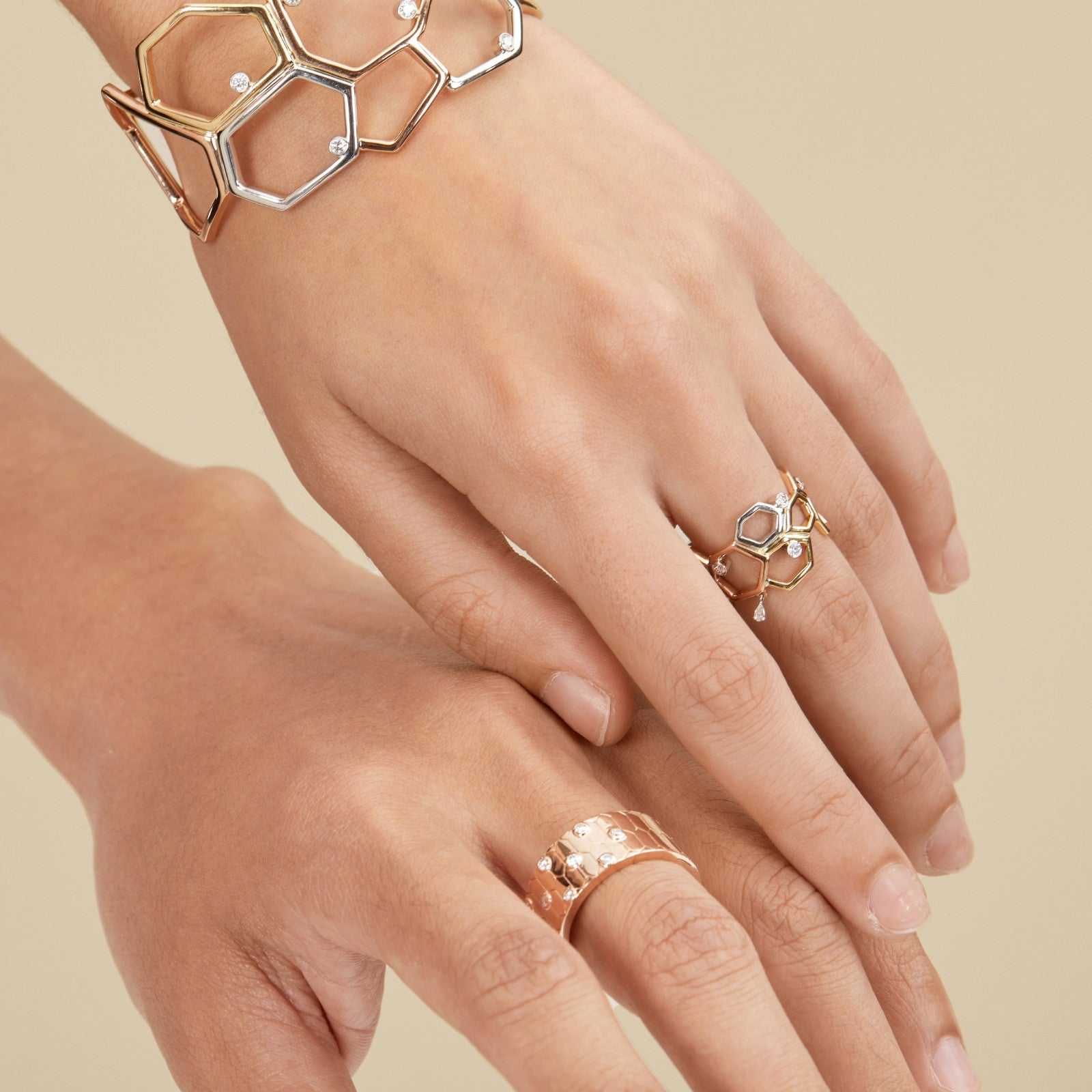 The design of this series is inspired by the honeycomb. Outline the shape of the honeycomb with simple irregular contours and bring out the vibrancy with diamonds of different shapes. Sweetest love comes in all forms and shapes, by experiencing life's up and down, remaining loves in heart though. Believe the best bliss in love is simplicity and sincerity. Stay humble and being bold. I dare to give it all and dare to bear it all. That's how the Honeycomb series to represent a sweet Love.