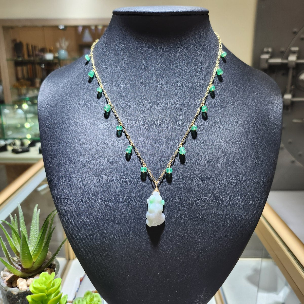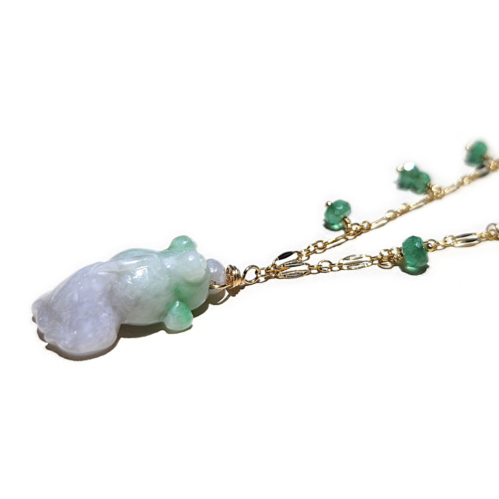 Type A Lavender and Green Jade Goldfish pendant hung on goldfilled chain adorned with Zambian Emerald beads . Goldfish symbolizes of good luck and good fortune.