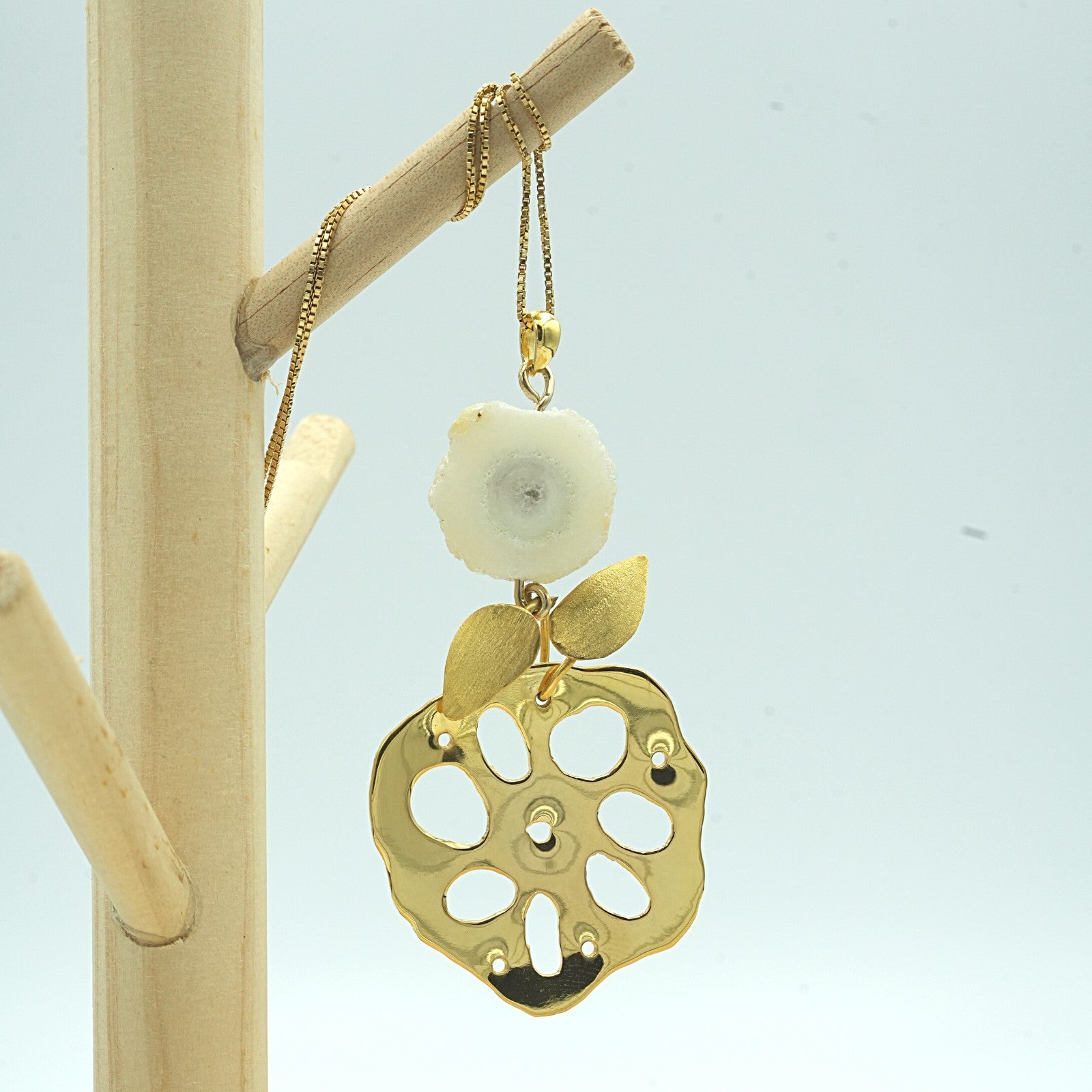 Fun and eyecatching lotus root disc with white quartz stalactitie flower . Part of the LotusRoot Design series